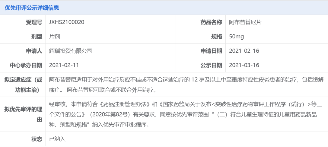 在中国,辉瑞于2021年2月递交阿布昔替尼片3个规格的上市申请,分别为50mg、100mg、200mg。该申请随后被中国国家药监局药品审评中心(CDE)以“符合儿童生理特征的儿童用药品新品种、剂型和规格”为由纳入优先审评,拟用于治疗12 岁及以上中至重度特应性皮炎患者。