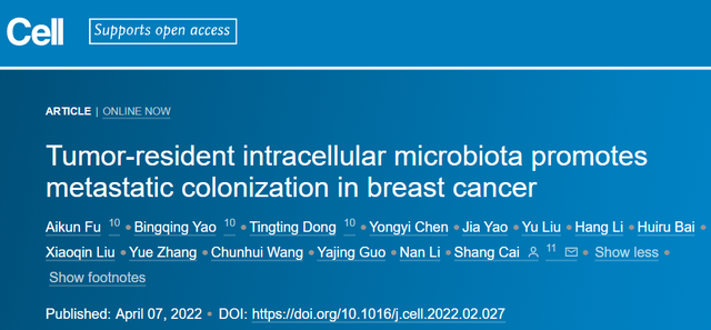 1. Aikun Fu et al. Tumor-resident intracellular microbiota promotes metastatic colonization in breast cancer. Cell, 2022, doi:10.1016/j.cell.2022.02.027.