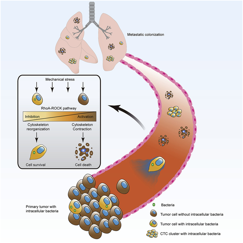 他们发现,这些细菌可以与癌细胞一起通过循环系统,在肿瘤转移中发挥关键作用。具体来说,这些乘客细菌能够调节细胞肌动蛋白网络,并促进细胞在抵抗血液的抗机械压力的过程中存活下来。