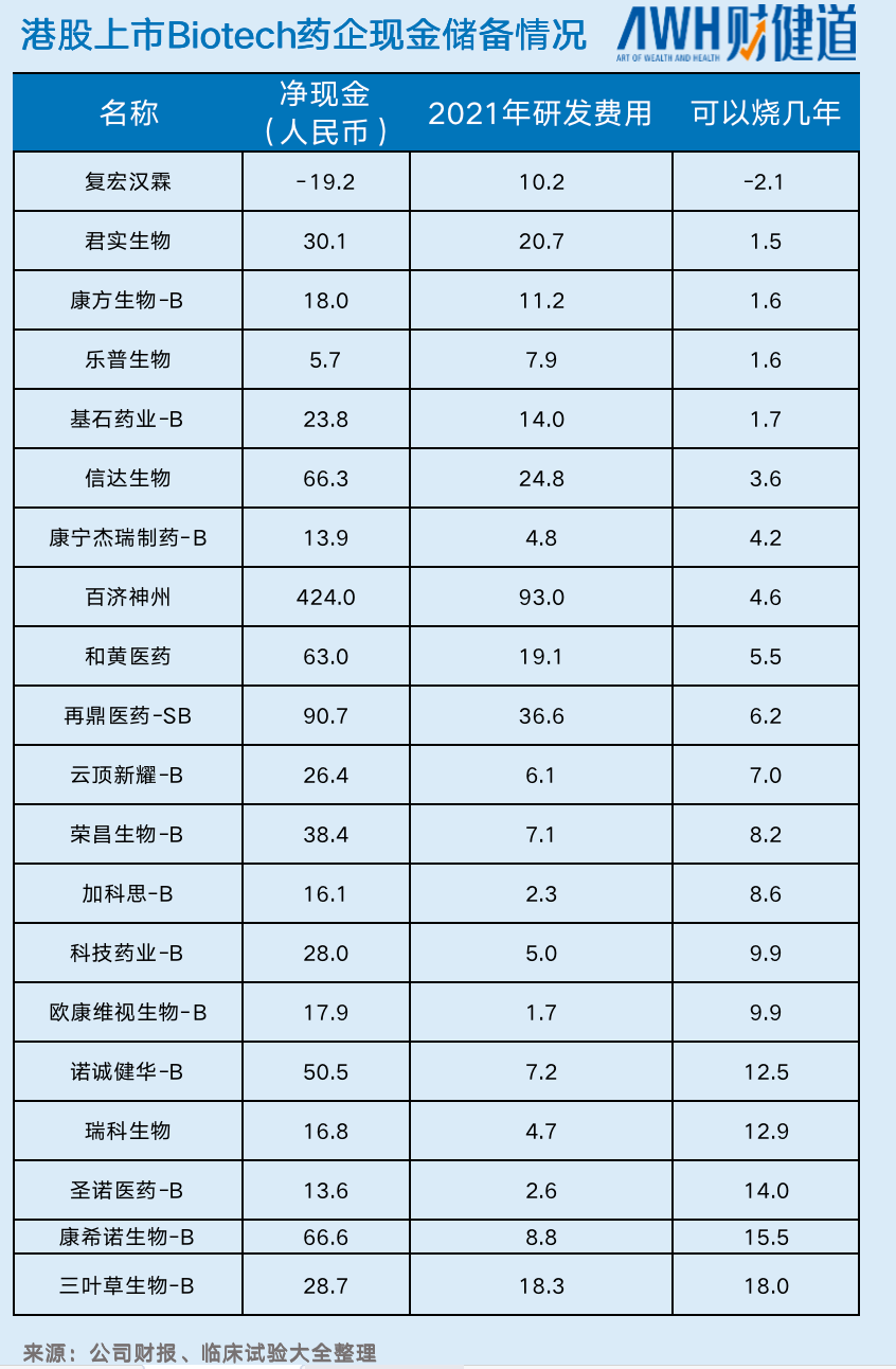 Biotech公司的“退潮”还只是个开始。 北极光创投合伙人宋高广对《财健道》表示,从客观角度来看,创新药行业市场竞争激烈,支付环境也比较单一,很多初创期Biotech公司账上很难储备维持两年运作的资金。 在宋高广看来,产品本身缺乏竞争力,商业化路径比较远,账上“余粮”不足,这三种企业很可能会是先倒下的一批。 医药行业资深人士阿基米德同样表示,今年并非Biotech企业“消失”的高峰期,真正的“生存挑战”是在2年后。 港股18A企业的现金储备情况是阿基米德对这一问题的重要判断依据之一。对Biotech来说,在资本输血锐减的局面下,现金储备显得十分重要。只有血够厚——至少能支撑2年以上的研发支出,才有可能熬过寒冬。