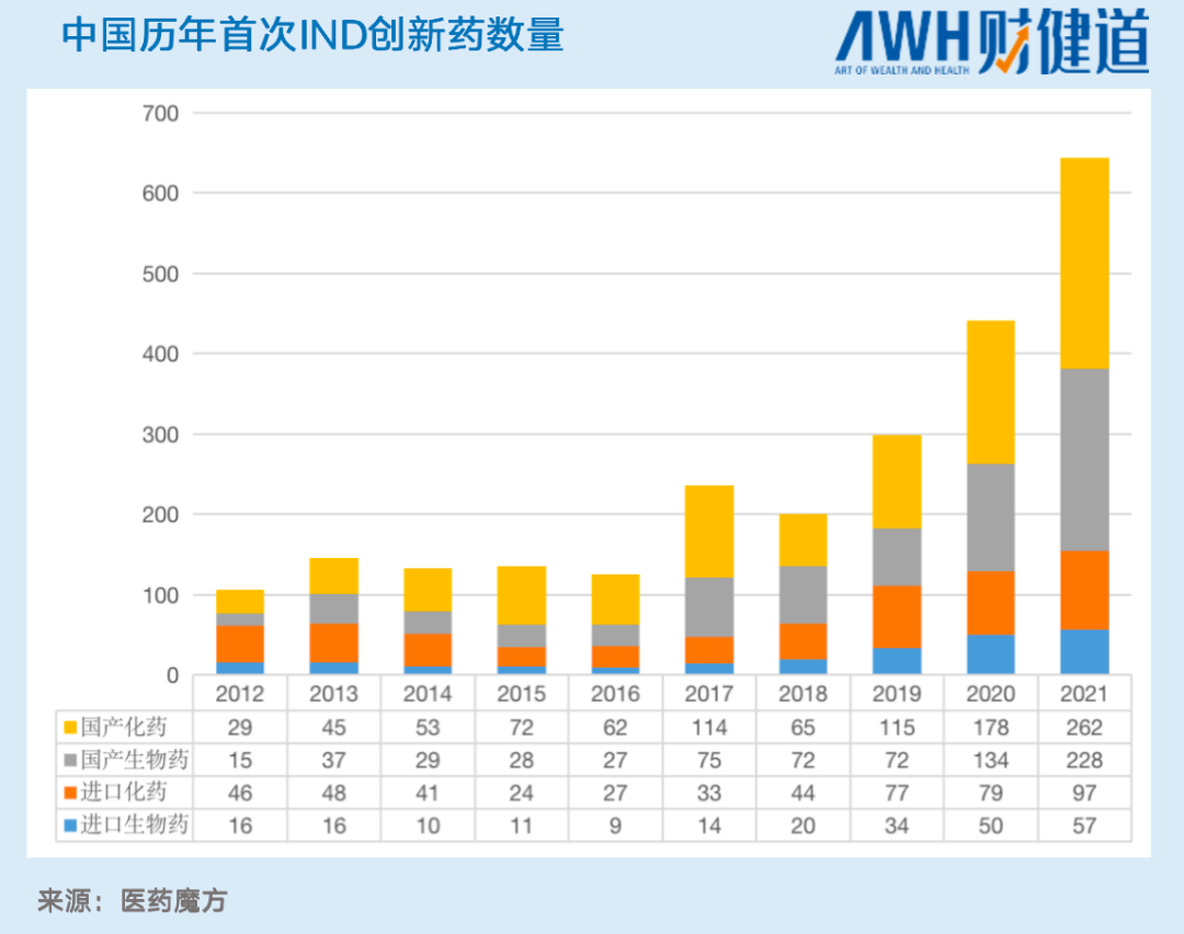 2016年,中国创新药企刚刚拉开初登舞台的序幕。多年以来,无论是IND(新药临床研究)还是NDA(新药上市申请),进口药物在国内创新药的品种中都占得“半壁江山”;但2017年以后,国产IND新药数量逐年增长,2019年-2021年总体CAGR(复合年均增长率)达47%,2021年国产药品更是占比达76%,国产化药、生物的发展势头与往日大不相同。
