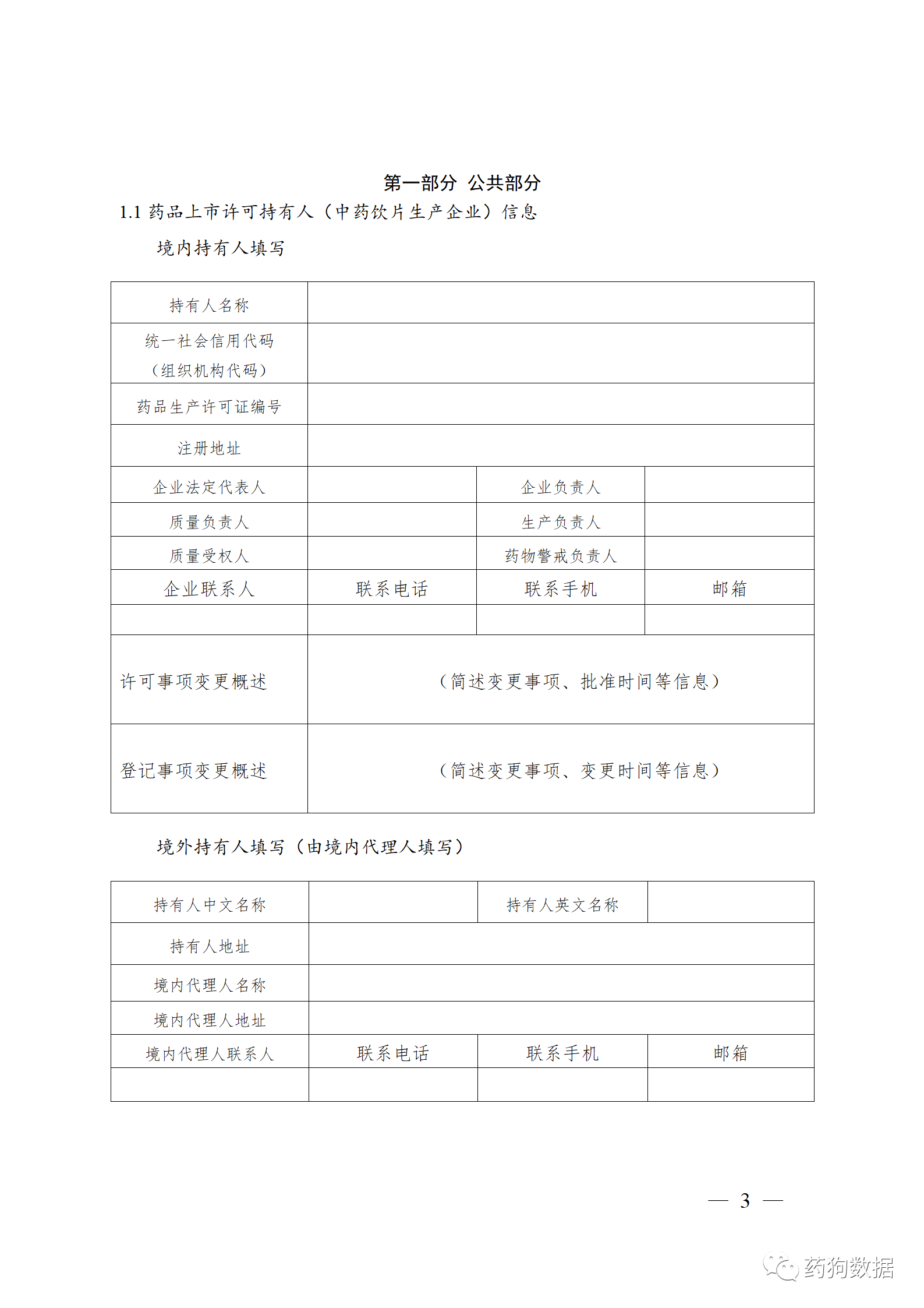 (一)公共部分,包括持有人信息、持有产品总体情况、质量管理概述、药物警戒体系建设及运行、接受境外委托加工、接受境外监管机构检查等情况。