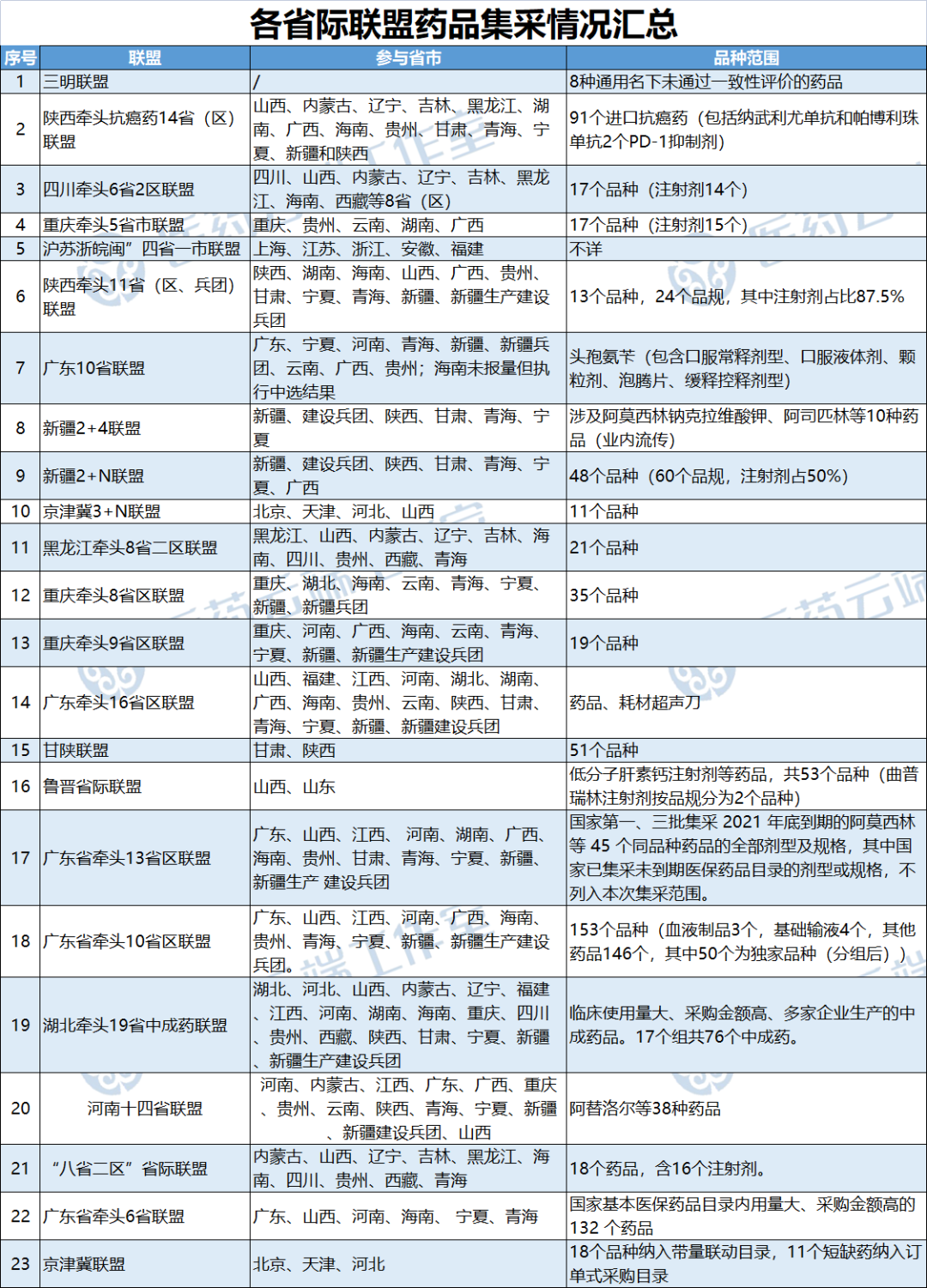 此外,“八省二区”采购联盟、广东牵头的药品采购联盟等已有联盟还将继续扩大品种覆盖面,天津、浙江、江西、山东、河南、陕西等省份还将牵头对部分药品、耗材品种开展联盟采购,鼓励各省自主参与。