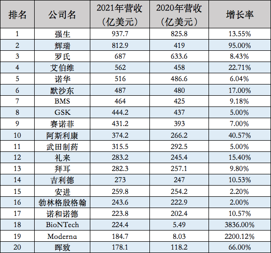 与疫情肆虐的2020年相比,2021年TOP20的制药公司没有一家收入下降,甚至大部分企业增长超5%。