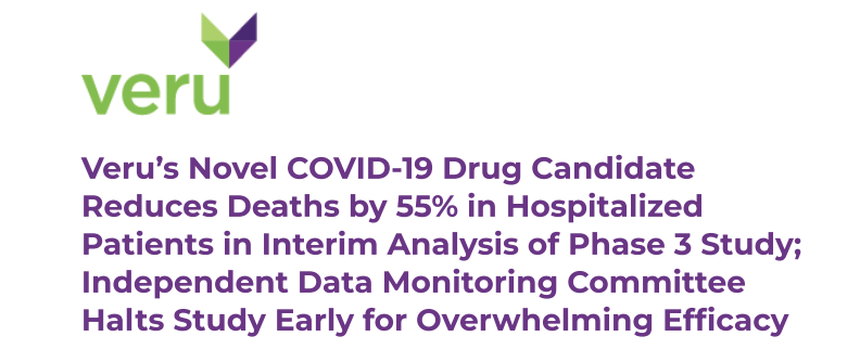 1.Veru’s Novel COVID-19 Drug Candidate Reduces Deaths by 55% in Hospitalized Patients in Interim Analysis of Phase 3 Study; Independent Data Monitoring Committee Halts Study Early for Overwhelming Efficacy
