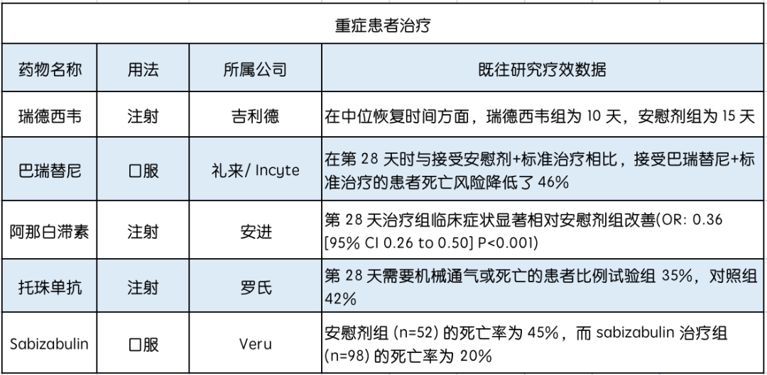 Veru原本将Sabizabulin视为乳腺癌的“重磅炸弹”,但在开发中,发现该药同时具有广泛的抗病毒和抗炎特性。这种特性赋予了Sabizabulin治疗新冠患者的潜力,且治疗效果受到病毒变异的影响较小。 该III期临床试验,在约210名住院的患有急性呼吸窘迫综合征(ARDS)和死亡高危的中重度新冠患者中展开,评估口服、每日一次剂量的Sabizabulin 9mg与安慰剂的疗效(患者以2:1的比例随机分配给Sabizabulin治疗组和安慰剂组)。 两组患者均可接受标准护理,包括瑞德西韦、地塞米松、抗IL-6受体抗体和JAK抑制剂。这项试验在美国、巴西、哥伦比亚、阿根廷、墨西哥和保加利亚进行。研究涉及变异株包括Delta和Omicron,主要疗效终点是在第60天死亡的患者比例。 IDMC对随机纳入研究的前150名患者进行中期分析——与安慰剂相比,Sabizabulin可将死亡率降低55%,口服给药耐受性好,安全性相似。(截至新闻稿发布,次要疗效终点仍在分析中)。此前2021年,在Veru报告的II期结果中,Sabizabulin将该类患者死亡率降低了82%。 目前用于重度新冠患者治疗的药物,主要有瑞德西韦、巴瑞替尼、阿那白滞素和托珠单抗。以下,写意君整理了这些药物既往的疗效数据,用以和Sabizabulin直观对比。