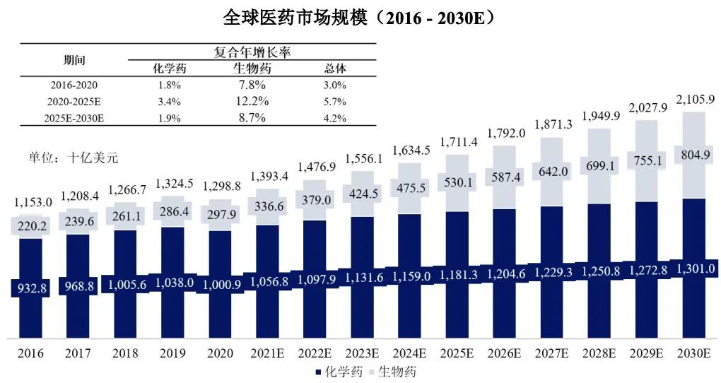 2002年,全球首个全人源单抗药物阿达木单抗(商品名:修美乐,英文商品名Humira)上市后,全球生物药领域开启了20年的高速发展并仍保有较大增长潜力。修美乐曾连续8年蝉联全球药物销售额榜首,虽然2021年由辉瑞和BioNTech联合研发的mRNA新冠疫苗Comirnaty营收达到了创纪录的367.81亿美元,成为新“药王”,但修美乐的2021年业绩也首次突破200亿美元,达到206.94亿美元。与化药相比,生物药市场增长迅速,在全球医药市场中占比持续攀升。据弗若斯特沙利文报告,2016年至 2020年,全球生物药市场从2202亿美元增长至2979亿美元,复合年增长率达7.8%;到2025年将增长至5301亿美元,2020年至2025年复合年增长率达12.2%;到2030年将进一步增长至8049亿美元,2025年至2030年复合年增长率达8.7%。