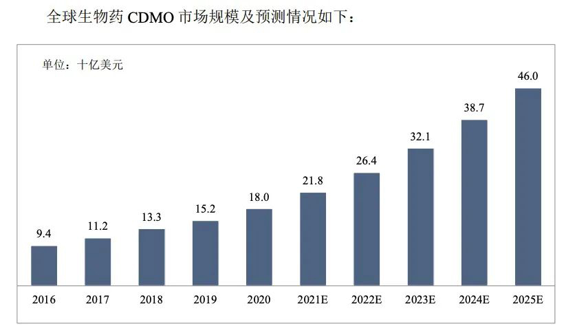 然而新药开发九死一生,业界一直流传着“双十定律”的说法,即开发一款新药平均需要10年、耗资10亿美元,许多企业为了降低风险,节约成本,会选择CDMO企业为其提供工艺研发及生产服务。同时,MAH制度下产、研、销分离,助力CDMO企业获得更多新药合作机会。况且生物药研发热度不减,相对于化药,生物药的复杂性也影响着新药开发的成功率,促使生物药CDMO业务乘势而上。全球生物药CDMO市场从2016年的94亿美元增长至2020年的180亿美元,2016年至2020年的年复合增长率为17.6%。未来受创新生物药上市和生物类似药增加药物可及性的驱动,该市场将继续保持快速增长,预计到2025年将达到460亿美元。2020到2025年的年复合增长率为20.7%。