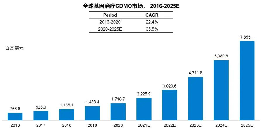 目前全球基因治疗CDMO行业处于快速发展阶段。2016年至2020年,其市场规模从7.7亿美元增长至17.2亿美元,年复合增长率达22.4%;预计到2025年,全球基因治疗CDMO市场规模将达到78.6亿美元,2020年至2025年的年复合增长率将上升至35.5%。