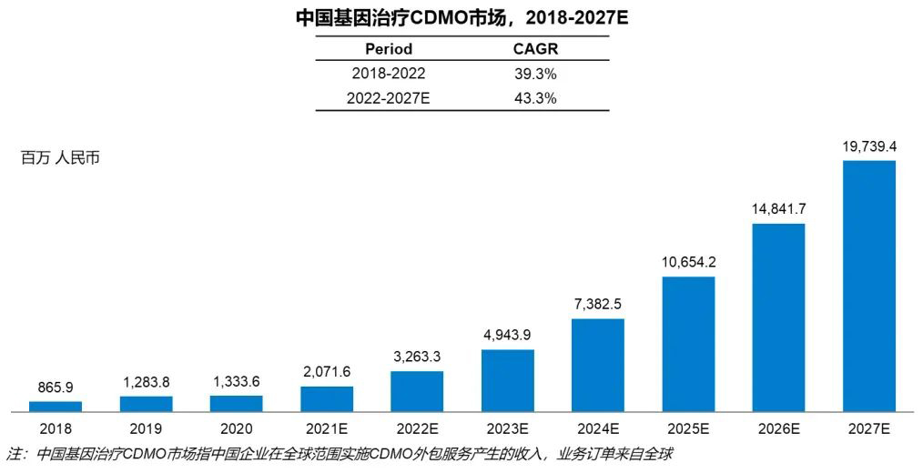 而在国内,基因治疗CDMO行业经过近年的稳定增长,将迈入高速发展阶段。2018年至2022年,国内CDMO市场规模从8.7亿元增长到预计32.6亿元,年复合增长率达39.3%;预计到2027年,市场规模将增长至197.4亿元,2022年至2027年的预期年复合增长率将高达43.3%。