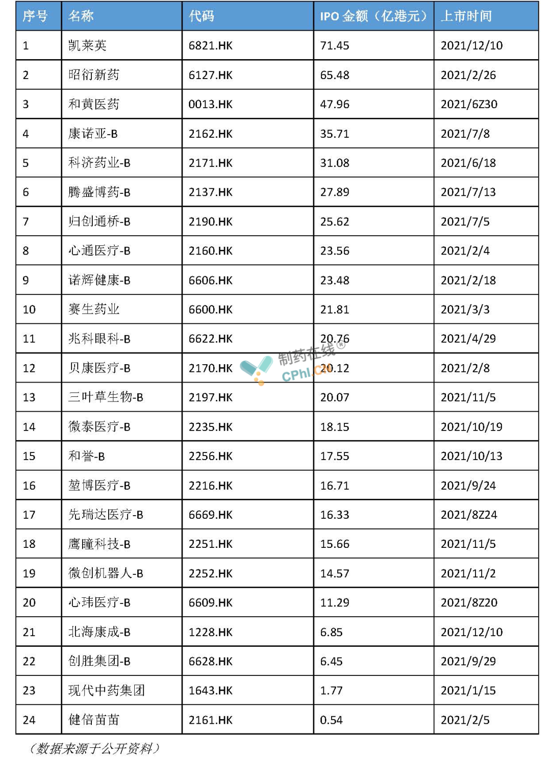 2021年,共24家中国生物医药企业赴港上市,募资金额达560.9亿港元。