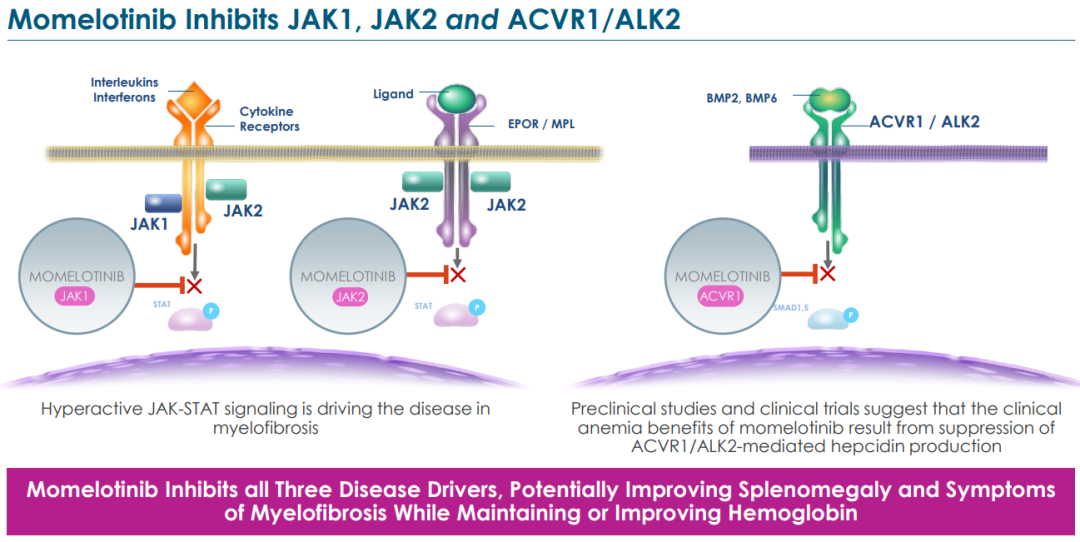 Momelotinib 具有不同的差异化作用模式,在关键信号通路上具有三个关键信号抑制活性,激活素 A 受体、I 型 (ACVR1)/激活素受体样激酶-2 (ALK2)、Janus 激酶 (JAK) 1 和 JAK2。。这种活性可能会对贫血产生有益的治疗效果,并减少输血的需要,同时还可以治疗骨髓纤维化症状和脾脏反应症状。2022 年 1 月, Sierra Oncology 公布了 MOMENTUM III 期试验的阳性顶极结果。该研究达到了所有主要和关键次要终点,表明Momelotinib在症状、脾脏反应和贫血方面取得了统计学意义和临床意义的益处。