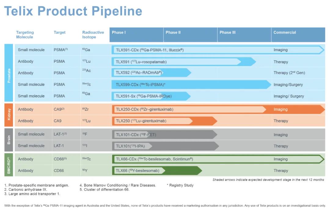 Telix 是一家处于临床后期的生物制药公司,总部位于澳大利亚墨尔本,在比利时、日本、瑞士和美国设有国际业务。Telix使用分子靶向辐射( MTR )开发诊断和治疗产品,研究管线主要集中在前列腺癌、肾癌、脑癌(胶质母细胞瘤)和血液系统癌症以及一系列免疫和罕见病等有重大未满足医疗需求的领域。公司的主要产品 Illuccix(68 Ga PSMA-11)已获得FDA和澳大利亚治疗用品管理局 (TGA)批准。