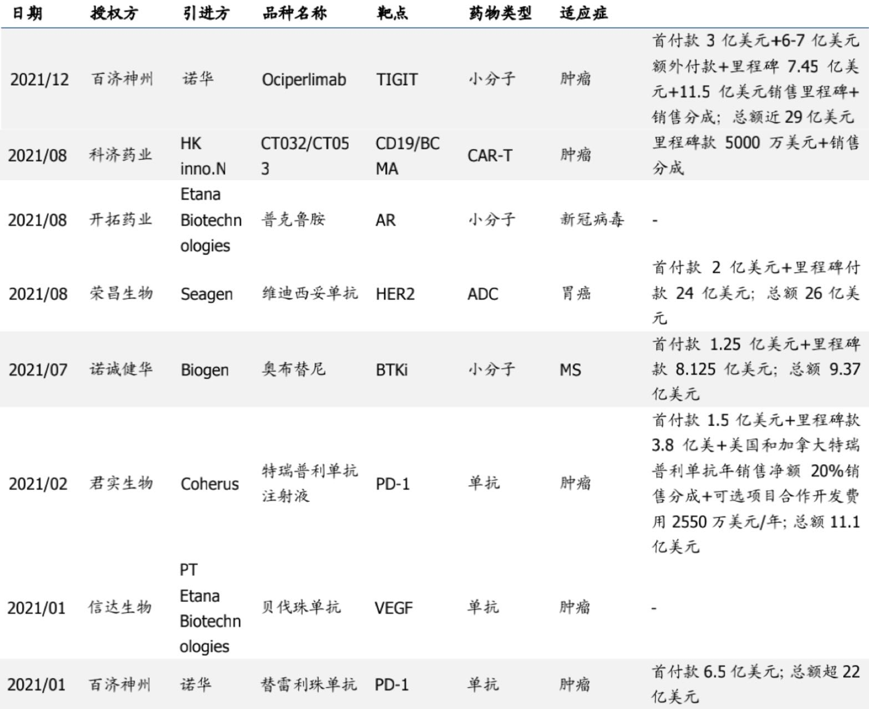 据不完全统计,过去一年,百济神州、信达生物、君实生物、荣昌生物、开拓药业、科济药业等都实现了创新产品的海外授权合作。其中,百济神州在2021年的年初与年末两次与诺华达成项目授权合作,涉及PD-1与TIGIT产品,总额超过50亿美元。而荣昌生物的ADC产品维迪西妥单抗更是实现了单笔出海交易总额高达26亿美元。