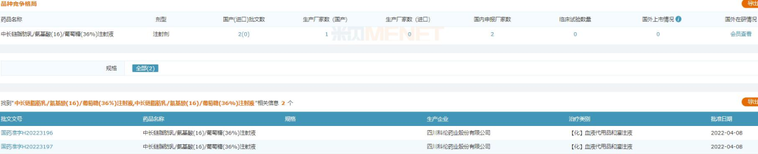 中长链脂肪乳/氨基酸(16)/葡萄糖(36%)注射液竞争格局