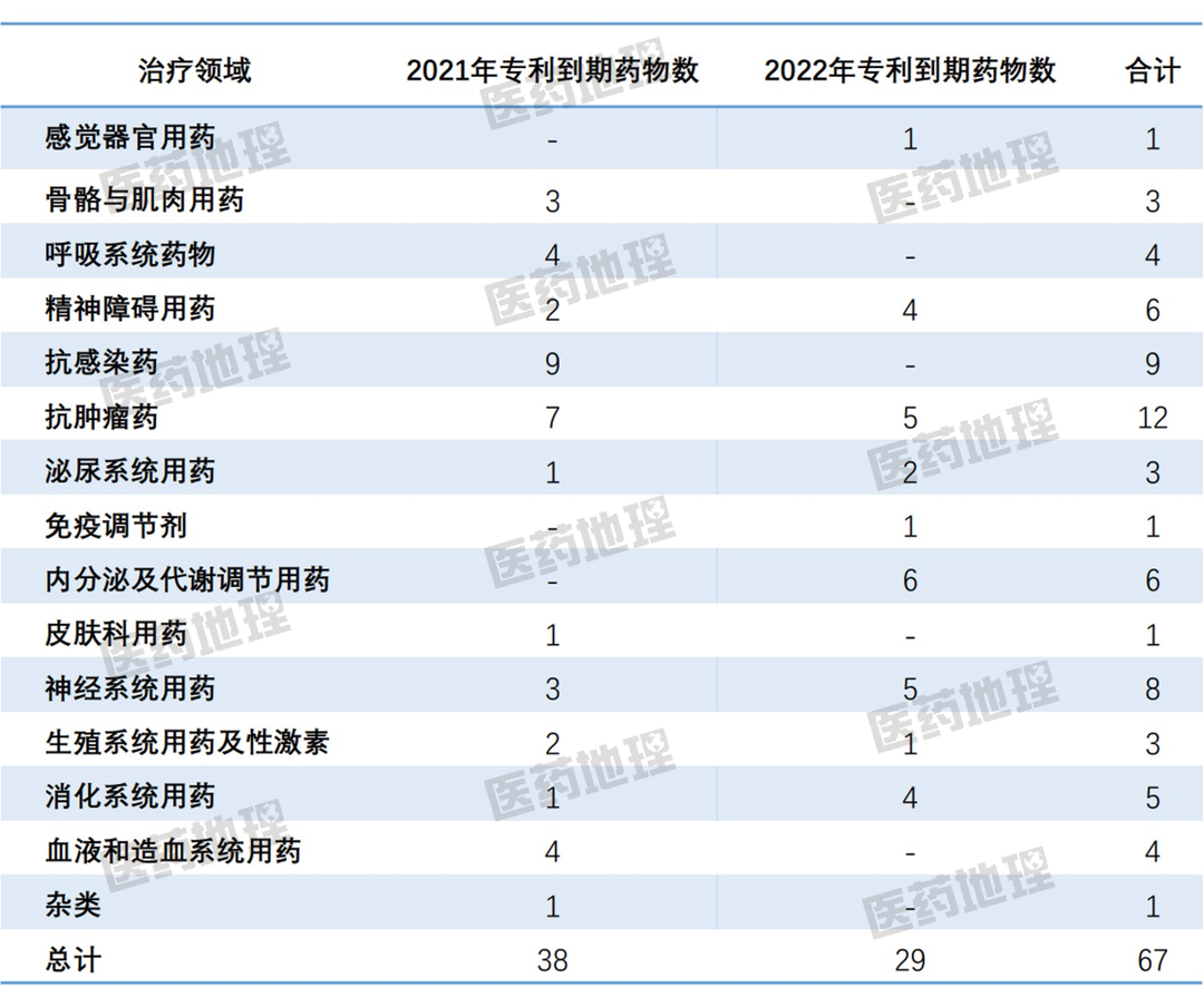 表1: 2021年和2022年专利到期药物数量及治疗领域分布