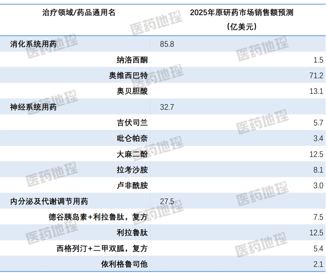 近两年专利到期药物2025年的市场规模超百亿美元。具体到各治疗领域及通用名,市场规模预测值排名靠前的重点领域分别为消化系统用药、神经系统用药、内分泌及代谢调节用药、泌尿系统用药、抗肿瘤用药。