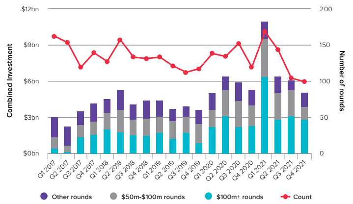 但我们也应该注意到,2021 年融资金额的增长主要发生在第一季度,之后VC融资逐渐下降,在去年末融资情绪落入低谷。
