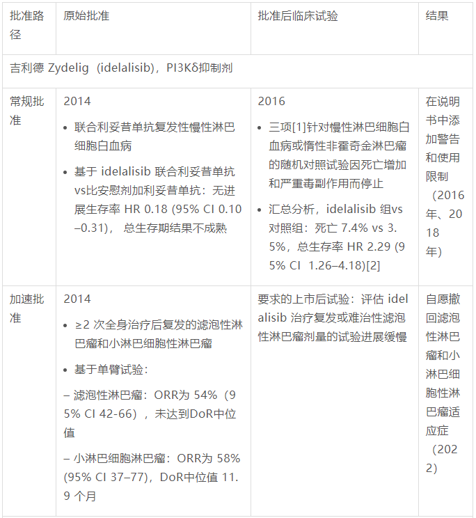 FDA认为,PI3K 抑制剂在血液系统恶性肿瘤中的使用经验说明了当前在单臂试验中使用 ORR 来支持初步批准的范式所面临的挑战: