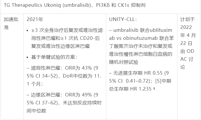 – 由 TG Therapeutics, Inc. 提交的umbralisib和ublituximab的补充新药申请,这两种产品联合用于治疗慢性淋巴细胞白血病或小淋巴细胞淋巴瘤的成年患者– 现有 umbralisib 适应症,加速批准的复发性或难治性滤泡性淋巴瘤和边缘区淋巴瘤成年患者