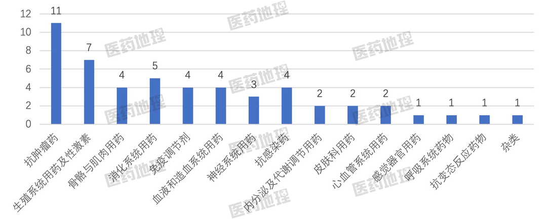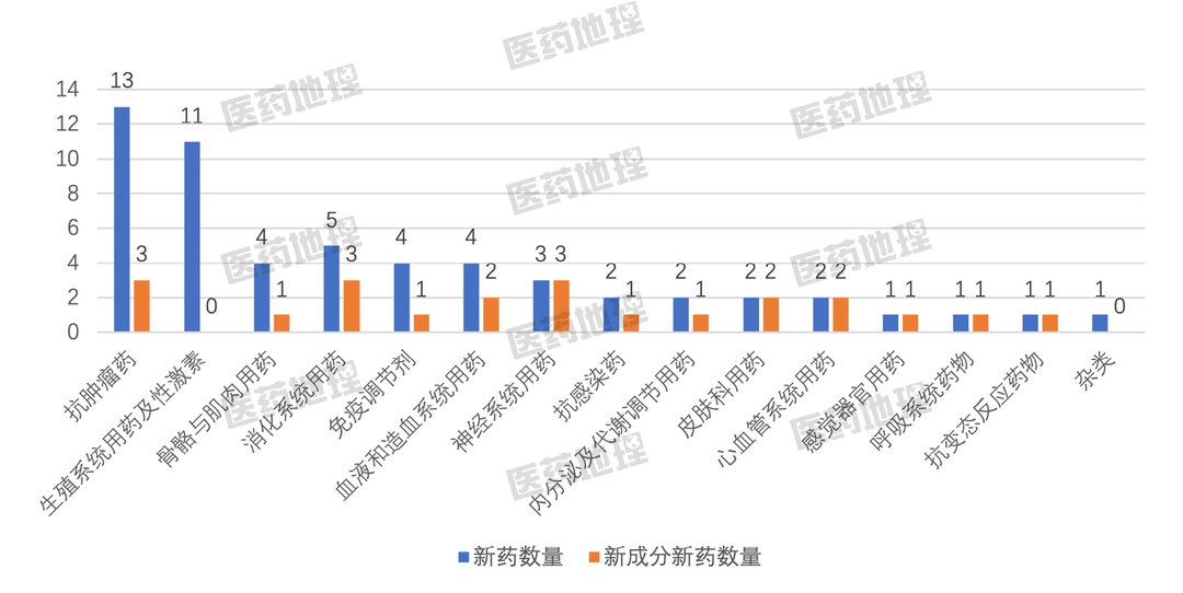 根据药品治疗类别分类,新药获批数量最多的药物类别为抗肿瘤药、生殖系统用药及性激素和骨骼与肌肉用药,其数量分别为13个、11个和4个。而含有新成分新药最多的药物类别为抗肿瘤药、消化系统用药和神经系统用药。