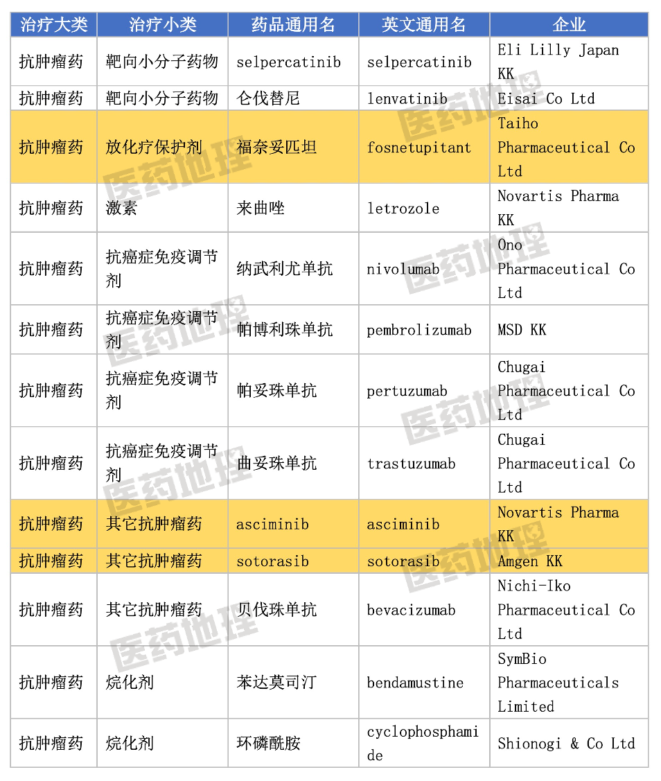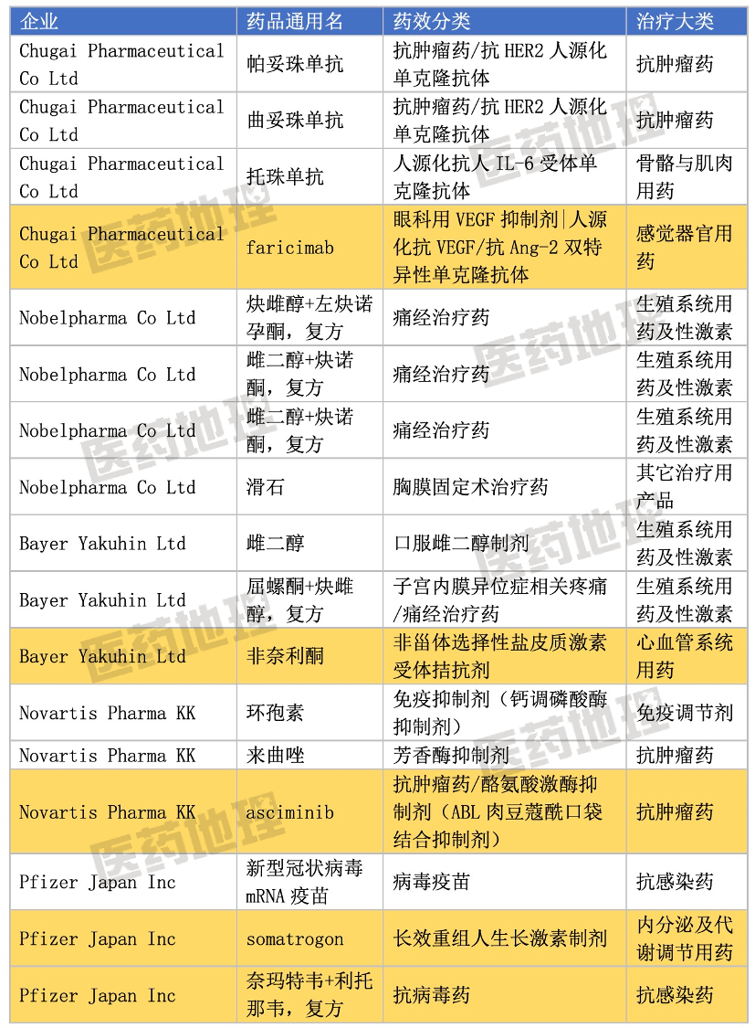 在所有获批企业中,获批新药数最多的企业是Chugai(中外)、Bayer(拜耳)、Nobelpharma(诺贝仁制药)、Novartis(诺华)和Pfizer(辉瑞),Chugai(中外)和Nobelpharma(诺贝仁制药)获批4个新药,其余三家获批3个新药。具体药物见下表(其中标黄的为新成分新药)。