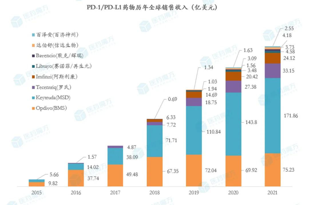 当前,全球范围内共获批上市了19款PD-1/PD-L1药物,相较于2020年增加了7款产品,其中6款为国产PD-1/PD-L1药物。尽管竞争激烈,但全球市场规模依旧快速增长,已经超过330亿美元。