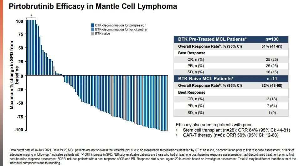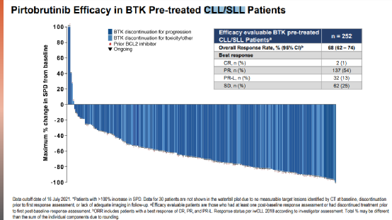 BTK C481S突变的新一代产品进展不断,特别是Pirtobrutinib在2021年ASH会议上公布的数据再次彰显竞争优势。数据显示,无论是BTK治疗疾病进展还是不耐受停药,接受Pirtobrutinib治疗都具有显著疗效,特别是CLL/SLL患者中,优势更加明显。