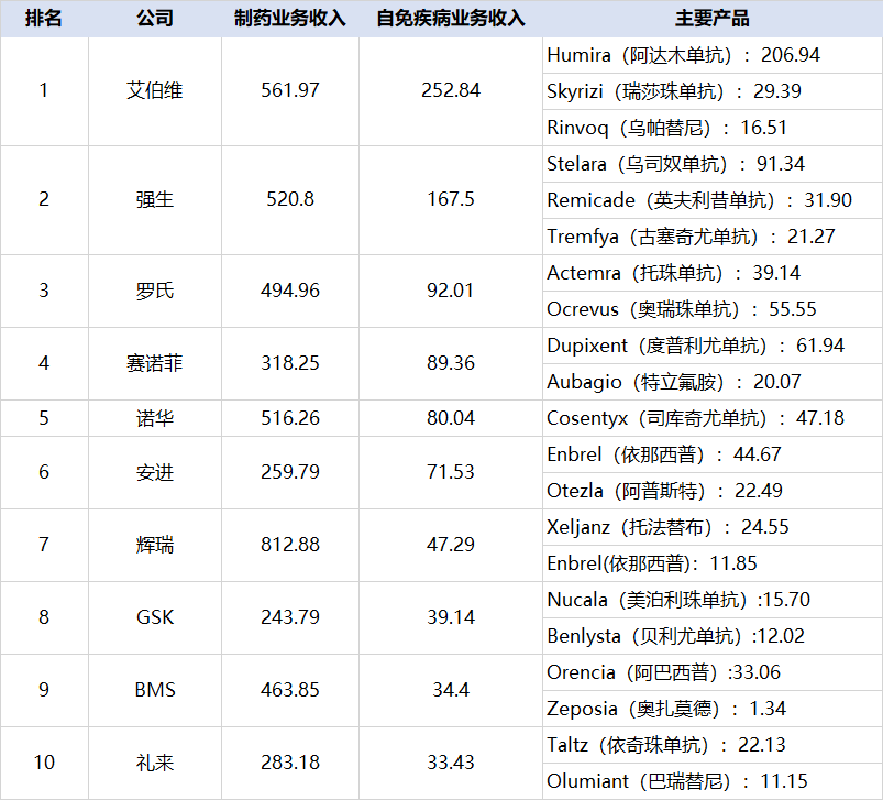 2021年全球自身免疫疾病业务巨头TOP10