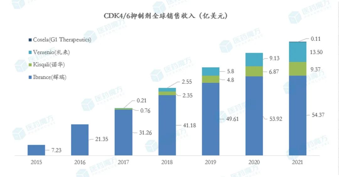 2021年,CDK4/6 抑制剂领域的竞争趋势也没有太大变化,依旧是Ibrance一家独大,Verzenio和Kisqali奋起直追。