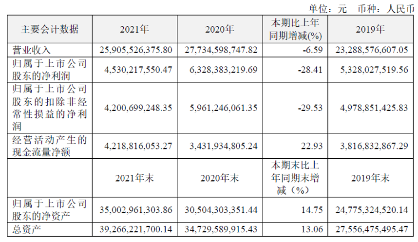 4月22下午,恒瑞发布2021年年度报告,2021年,公司实现营业收入259.06亿元(-6.59%),归母净利润45.30亿元(-28.41%),扣非净利润42.01亿元(-29.53%)。向全体股东按每10股派发现金股利1.60元(含税)。2022年第一季度报告,报告期营业收入54.79亿元(-20.93%),归母净利润12.37亿元(-17.35%)。