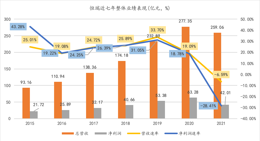 利润降幅大于营业收入降幅,首次出现营收利润双下滑,首次出现年度和下一季度连跌,对此,恒瑞医药公司表示:由于加快研发投入、集中带量采购和国家医保谈判产品大幅降价导致毛利率下降;原辅材料及其他各项成本价格持续上涨,以及2021年初运营和人力成本高等综合因素,影响了公司的业绩。公司表示,未来将加大研发投入,深化国际化战略,推动公司仿制药重点品种和创新药产品海外上市销售。