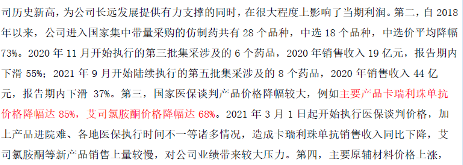 2021年年报显示,自2018年以来,共有28个品种进入国家集采的仿制药,恒瑞医药中选18个品种,中选平均降价73%。其中,2020年11月开始执行的第三批集采涉及6个药品,2021年9月开始执行的第五批集采涉及8个药品。2020年销售收入报告期内下滑37%。卡瑞利珠单抗(PD-1抗体)价格降至低于3000,幅度达85%,生产量同比增减241.69%;销售量同比增减360.77%。艾司氯胺酮降幅达68%(作为新产品,市场认可度不足,销量本身就不客观),加上材料成本价格上涨,雪上加霜。