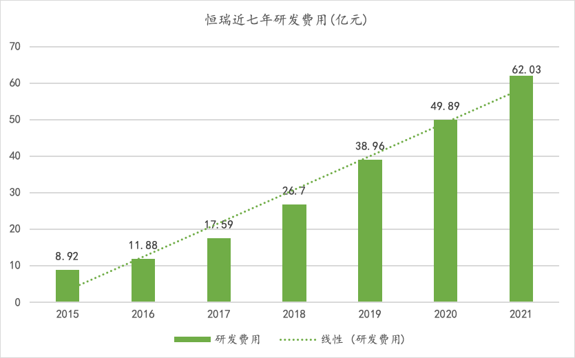 另外,恒瑞医药加大研发投入也很大程度上影响了当期利润。2021年,公司累计研发投入达62.03亿元,比上年增加12.14亿元,同比增长24.34%。期内研发投入占销售收入比重达23.95%,创历史新高。研发费用62.03亿元中有2.6亿元是资本化,这来自2021年11月,恒瑞医药首次宣布将一部分研发费用资本化,突破长期以来的固执。