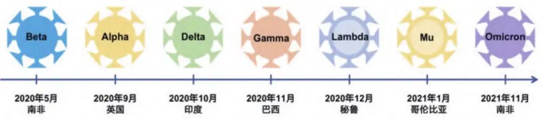 图1为主要新冠变异毒株首次报道的时间和国家,来自《2021年新冠病毒变异、跨种传播及疫苗和药物研究热点回眸》