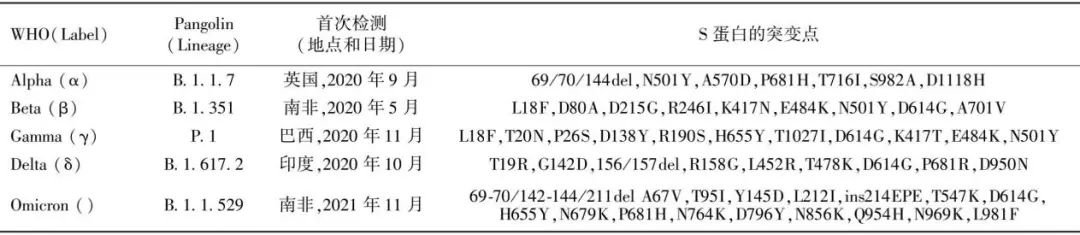 WHO 根据病毒公共卫生风险大小,依次将新冠变异毒株分为3个组。第一个是“值得关注的突变株”(VOC, variant of concern),包括 Alpha(对应的 PANGO lineage 为 B.1.1.7)、Beta(B.1.351)、Delta(B.1.617.2)、Gamma(P.1)和 Omicron(B.1.1.529)突变株(如图3);第二个是“待观察的突变株”(VOI,variant of interest),包 括 Lambda(C. 37)和 Mu(B.1.621)突变株;第三个是“监控下的变异毒株” (VUM, variant under monitoring),2021年12月22日,该分组包括 5 种突变株。