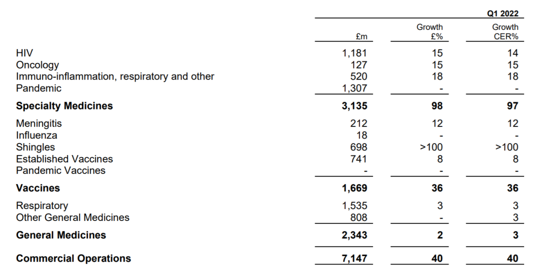 4月27日,GSK公布2022Q1业绩,实现收入97.8亿英镑(130.56亿美元),同比增长32%。从业务上看,专科药物收入同比接近翻倍,疫苗收入增长36%,消费者保健业务也有14%的双位数增长。