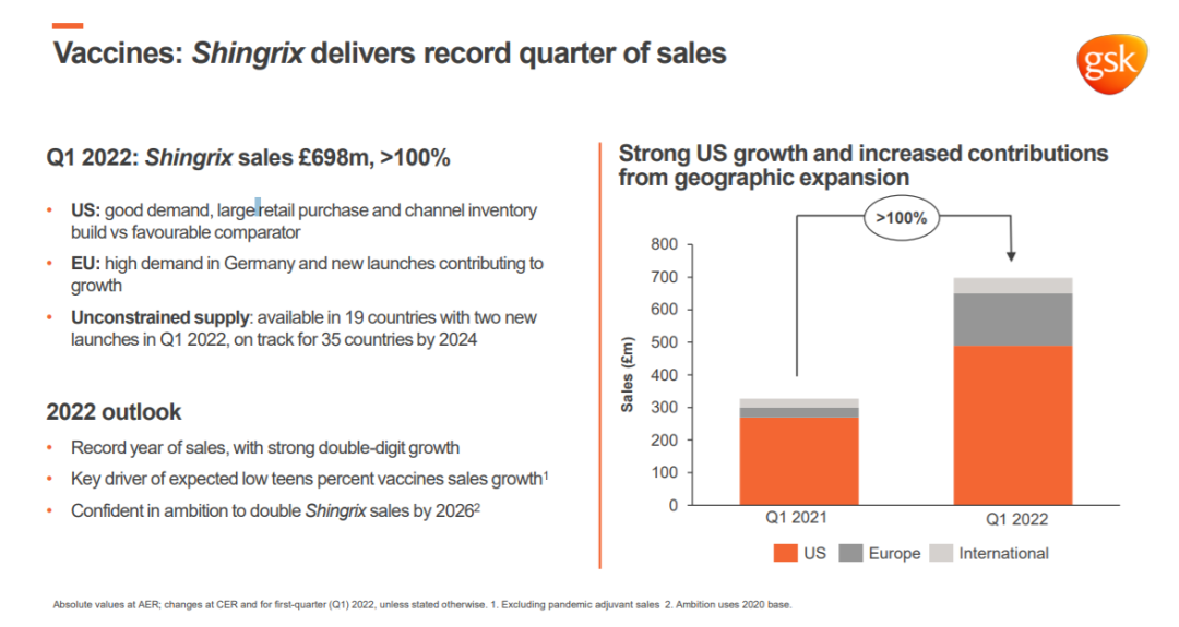 带状疱疹疫苗Shingrix销售收入6.98亿英镑,同比增长超过100%,刷新了季度销售收入记录,这主要得益于美国、欧洲市场需求的快速增加,以及产能供应上的保障能够覆盖到19个国家。Shingrix峰值出现在2020年,为19.89亿英镑,预计2022年会继续刷新销售记录,GSK认为Shingrix在2026年的销售收入相比当前将会实现翻倍,有望超过40亿英镑。