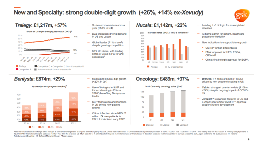 除上述两款极高增长药物外,GSK在HIV、免疫炎症和呼吸疾病、肿瘤业务领域相比去年同期都实现高双位数增长。包括三合一COPD/哮喘新药Trelegy(+57%),IL-5单抗Nucala(+22%)、系统性红斑狼疮药物Benlysta(+29%)。