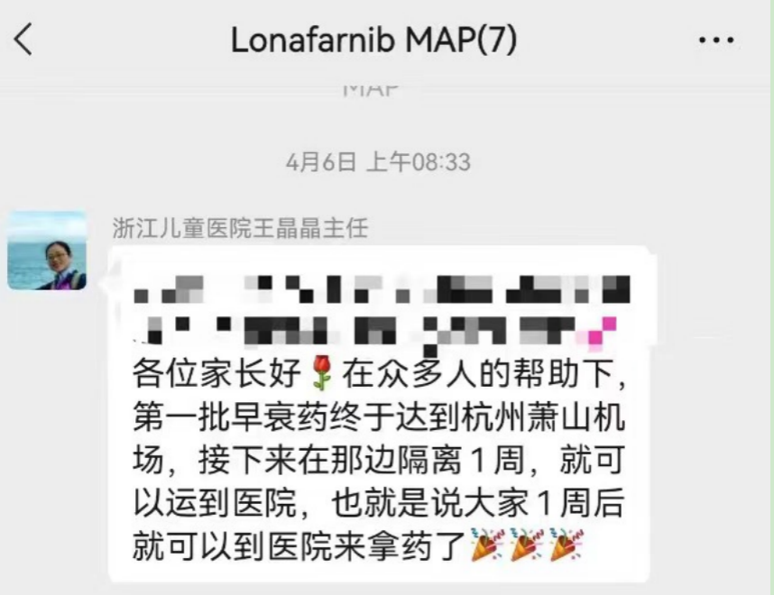 2022年4月6日,浙江大学医学院附属儿童医院肾脏内科副主任医师王晶晶告诉她,第一批用于治疗儿童早衰症的药物已经抵达杭州萧山机场,「机场隔离1周后,大家就可以到医院拿药了」。