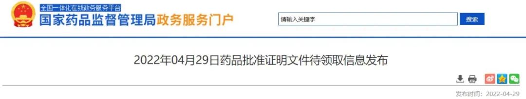 [1]2022年04月29日药品批准证明文件待领取信息发布 . Retrieved Apr 29, 2022. From https://www.nmpa.gov.cn/zwfw/sdxx/sdxxyp/yppjfb/20220429092503106.html