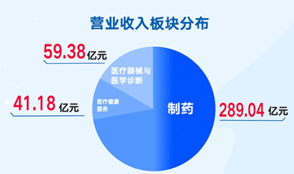 其中,制药板块贡献营收289.04亿元,占总营收的74.1%;医疗器械与医学诊断营收59.38亿元,占15.22%;医疗健康服务营收41.18亿元,占10.56%。