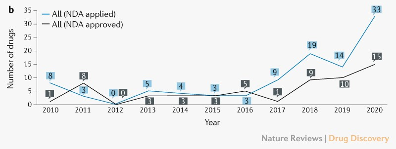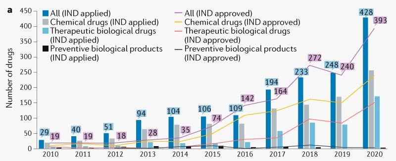 近日,为了评估这些改革措施以及政策对中国创新药物发展的影响,北京大学临床药理研究所所长崔一民博士联合国家药品监督管理局药品审评中心副主任王涛以及相关研究人员,对2010-2020年间中国获批的研究性新药(IND)申请数据和新药申请(NDA)数据进行了详细分析。