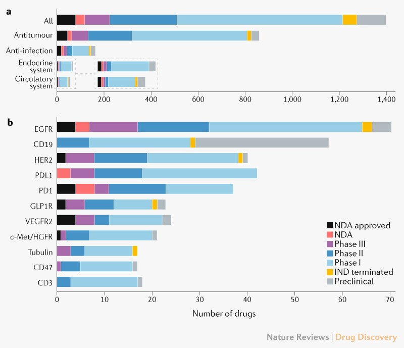 通过对首次IND申请获批的创新药进行分析发现,首次 IND 申请获批的创新药物主要治疗领域集中在肿瘤(864个, 62%)、感染(166个, 12%)、内分泌疾病(72个, 5%)和心血管疾病(60个, 4%)。其中,2016 年首次 IND 申请获批的肿瘤药物数量显着增加,较2015年增长了133%。 在首次 IND 申请获批的1404个创新药中,至少有 705 个(50%)达到了 I 期,同时分别有 286 个(20%)和 108 个(8%)药物达到了 II 期和 III 期。不过,大多数抗癌药物(57%)尚未超过 I 期。 总体而言中国主要仍旧处于快速跟进和渐进式创新阶段,58个获批NDA的创新药中只有3个是“first in class”,分别是: 冠昊生物控股子公司广州中昊药业有限公司开发的本维莫德(benvitimod),2019年5月在中国通过过优先审评审批程序上市,用于局部治疗成人轻至中度稳定性寻常型银屑病; 中国海洋大学、中国科学院上海药物研究所与上海绿谷制药有限公司研发的甘露特钠胶囊,其活性成分为甘露寡糖二酸(sodium oligomannurarate),2019年11月2日,国家药品监督管理局官网发布消息,甘露特钠获批上市,用于轻度至中度阿尔茨海默病,改善患者认知功能; 珐博进(FibroGen)首创的HIF-PH抑制剂roxadustat(罗沙司他),2018年12月roxadustat率先在中国获得批准,用于透析依赖型慢性肾脏病(DD-CKD)成人患者贫血治疗。2019年8月,该药在中国获批新适应症,用于非透析依赖性慢性肾病(NDD-CKD)成人患者贫血治疗。 相比之下,靶向 EGFR、PDL1 和 HER2 的“me too”药物有 40 多种,其中靶向 EGFR 的获批药物数量最多,其中由4个药物已上市,64个药物进入了临床试验阶段。这些集中的靶点和适应症相同的药物,未来可能会显著降低新药创新效率。
