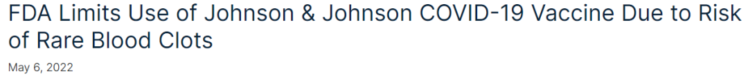 2022年5月6日,FDA宣布已将Janssen的COVID-19疫苗的授权使用限制在特定的18岁及以上的个人,这些人临床上无法接种其他获批的COVID-19疫苗或仅愿意接种Janssen的疫苗。