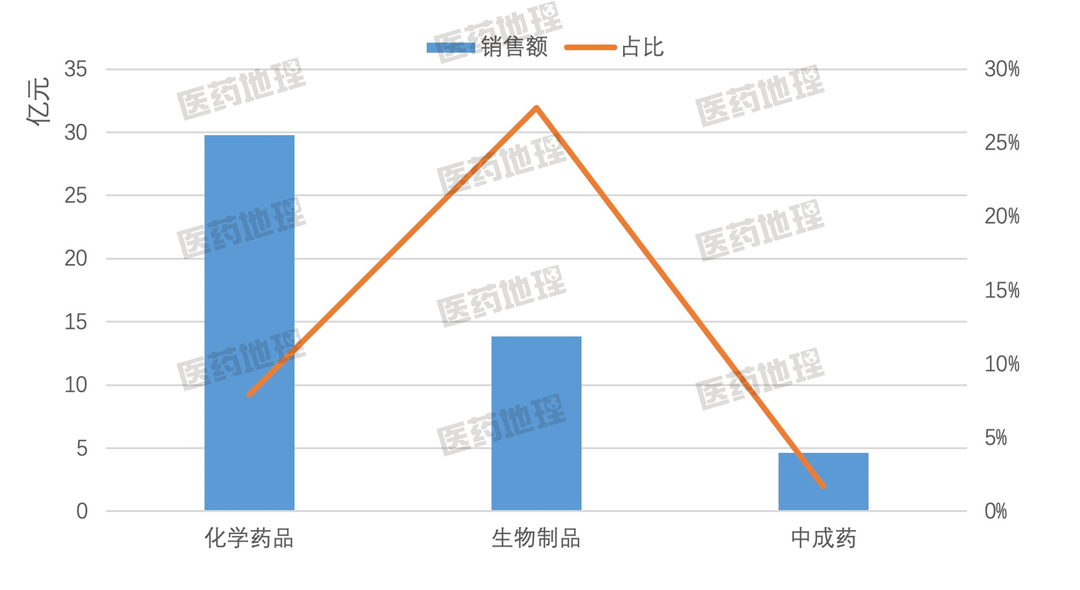 2021版医保目录国谈品种分西药和中成药两大部分,其中西药213个品种,中成药62个品种。RPDB数据显示,总计228个国谈品种在采样药店中有销售,2021年全年销售额合计在整个药店市场中占比6.8%。不过,不同类别药品差异巨大,生物制品药店零售市场中国谈品种地位举足轻重,占比高达27.4%(图1)。国谈品种中的化学药品销售额最高,但因化学药品整体零售市场规模巨大,相对占比就比较小,约为7.9%。中成药国谈品种单价相对不高且整体市场庞大,因此占比最小,仅占约1.7%。