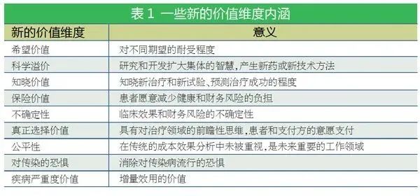 在药物经济学评价中,药品的价值一般用增量成本效果比值(ICER)表示,也就是一个质量调整生命年需要花费的成本(cost per QALY)。美国学者提出的药品价值评价框架(US Value Assessment Frameworks, VAFs),主要为上述成本和QALY值外,这里主要介绍一些新价值维度(表1)。