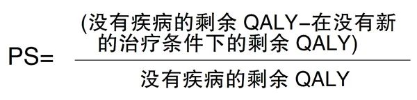 近年研究认为应该将疾病的严重程度(PS分值)列入ICER阈值的考虑中。可采用比例差额法(proportional shortfall method)的PS分值来表示。这种方法的原理是将病人因某种疾病在其剩余生命中造成的平均健康损失,与病人在没有该疾病的情况下可能拥有的全部潜在健康相比,PS分值在0(没有健康损失)和1(全部健康损失)之间。如指甲霉菌病PS值只有0.02,高胆固醇血症为0.25~0.49,乳腺癌转移病情较重,PS值为0.86。