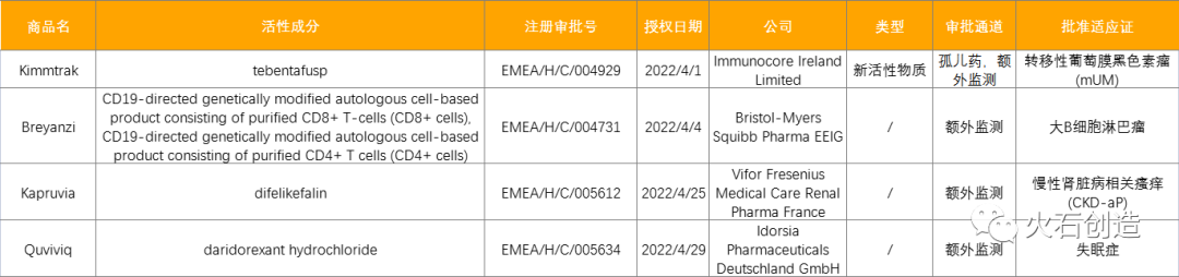 表2:2022年4月EMA授权药物列表