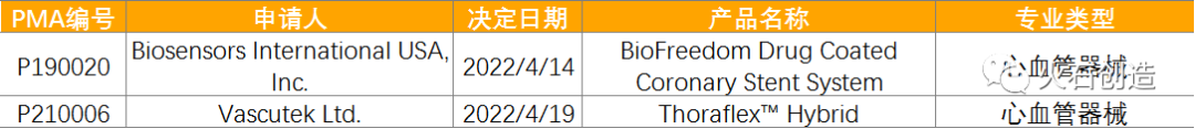 2022年4月有2个通过上市前批准(PMA)途径首次上市的产品。